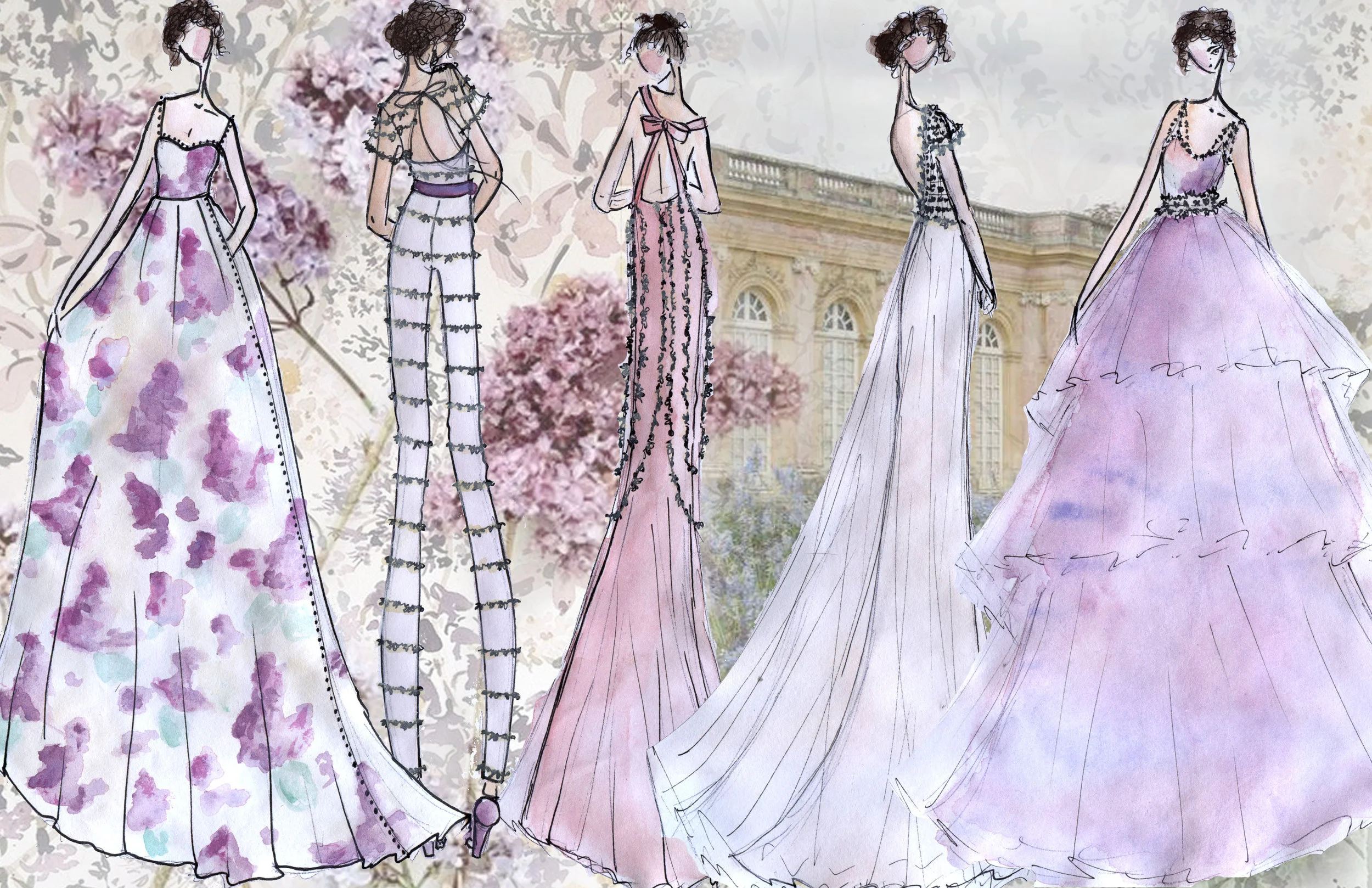 Once my concept has been solidified, fabrics have been finalized and my creative juices are flowing, I start working on sketches, a lot of sketches. For Le Jardin, I must have done around over 40 sketches, out of which 10 would be picked to be illustrated for my portfolio and 4 would be picked to create to be shown at the fashion show. Pictured below are the top designs, the Lilah, Jane, Carrie and Tara gowns in their earliest forms. Also pictured is an early version of the Sybil Jumpsuit.